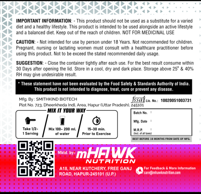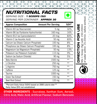 Premium Ingredients: Contains high-quality, clinically tested ingredients for superior performance. Quick Absorption: The fine powder mixes easily, ensuring fast digestion and bioavailability. Great Taste: Available in multiple flavors like Tropical Blast, Citrus Rush, and Berry Burst for a refreshing experience. Zero Sugar, Low Calories: Perfect for those looking to boost energy without the extra calories.